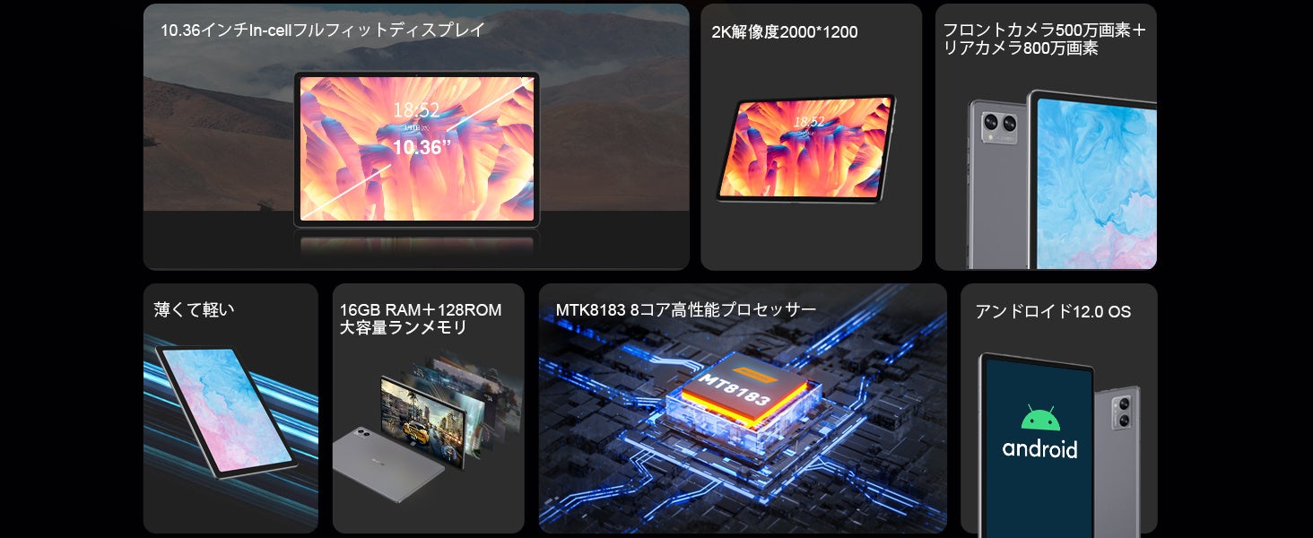 [MTK 8183 8コアCPU+8GB+128GB】MediaTek 8183は8コアCPU MT8183とMali -G72グラフィックプロセッサ+最大周波数2.0GHzのA73アーキテクチャの高性能コアを4個搭載した低消費電力の12nmプロセスで構築されており、Antutuランスコアは最大23万点、6GB LPDDR4X大容量メモリでより快適に楽しむことができる。 PUBGやSpeed Racerなどの大型ゲームも超高速でスムーズに動きます。 さらに、128GBの高速ストレージ容量により、より多くのアプリ、動画、写真などの保存に対応し、お気に入りの本、曲、写真、映画、ゲームなどをすべてダウンロードして保存することが可能です。 容量が足りなくなる心配はありません。