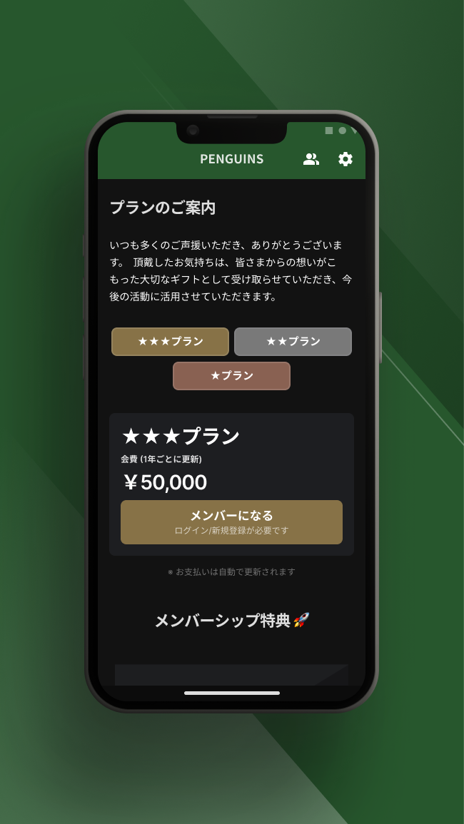 本アプリのメインテーマは”オールペンギンズ”です!ペンギンズを応援して下さる方全て、同じスペースで喜びや感動を分かち合えるようなアプリにしていけるよう、運営サイドもサプライズ含めアイデアを振り絞って盛り上げます! ブースターの応援がないと目標である日本一には届きません! 皆んなでペンギンズを全力応援しましょう! Let’s go GUINS!