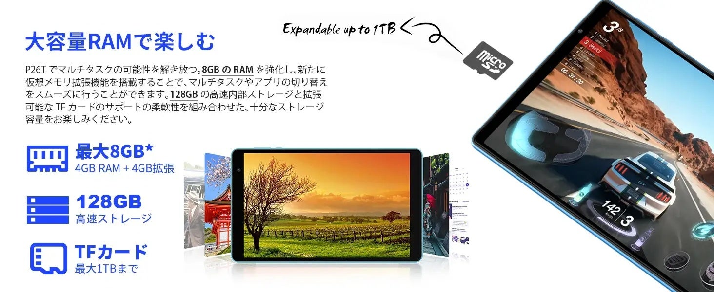 4GB+4GBの仮想メモリを追加され、合計8GBのメモリでマルチタスクやアプリの切り替えをスムーズに行うことができます。アップグレードされた「P26T」は、128GBの高速内部ストレージと拡張可能なTFカードのサポートの柔軟性を組み合わせた、十分なストレージ容量をお楽しみください。acデュアルバンドWi-Fiと、最大433Mbpsのネットワーク速度を持つより高速な5G周波数帯をサポートしています。効率的なBT 5.0により、周辺機器との接続を高忠実度に実現します。