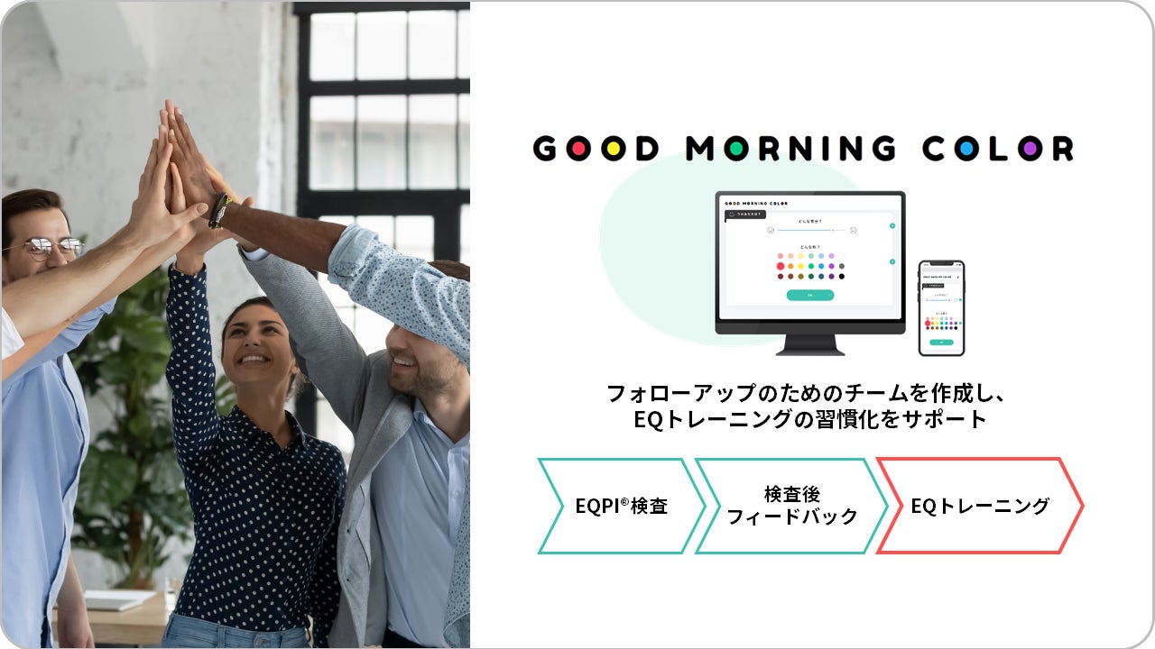 参加者はEQPI®検査とEQPI®アナリストによる検査結果のフィードバックを受け、自己理解を深めるとともに、高めたいEQやトレーニングの方向性を決定します。その後、㈱ignArtの提供するコミュニケーションアプリ「GOOD MORNING COLOR」にて日々のトレーニング状況のセルフチェックや仲間との共有を行い、継続的なEQトレーニングのサポートを行います。