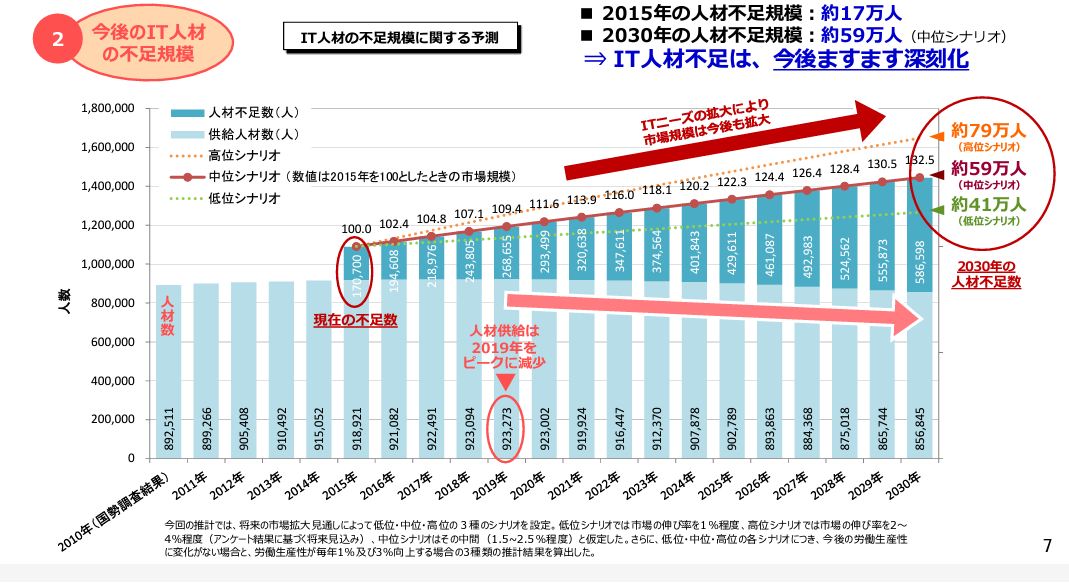 経済産業省によると、2019年をピークに人口減少等に伴いIT人材は減少傾向に向かうと予想されています。その一方で、IT需要の高まりによるIT人材の不足は将来的に40万~80万人とも想定されています。国内でのIT人材の育成に限界が見える中、オフショア開発はこの問題を解決するための一つの方法ではありますが、今までは、下流工程特にプログラミングに特化した、「安く」「大量のコード生成」を求められる形でした。