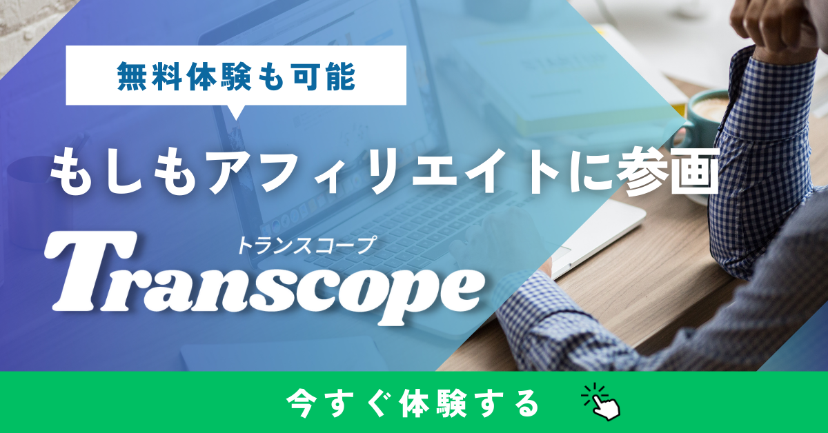 もしもアフィリエイト管理画⾯から、Transcope(トランスコープ)の広告リンク(バナーやテキスト)を取得いただき、広告掲載開始をお願いいたします。