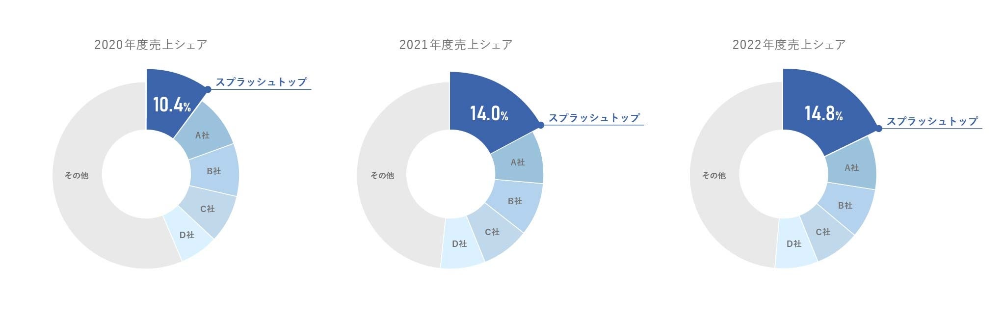 同市場調査レポートは、リモートワークソリューションを提供するベンダー98社を対象とし、そのうち主要49社に調査し、同市場の市場規模・ベンダシェア・中期予測を推計したものです。同市場調査レポートによると、2022年度のリモートワークソリューション市場の売上高は前年比15.1%増の2659.8億円の実績で、2023年度は前年比12.9%増の3001.6億の見込みとなっています。同レポートのリモートアクセスソリューション市場のベンダーシェアのうち、2022年のスプラッシュトップの売り上げは市場シェア14.8%となり、2020年度より3年連続の1位となり、また、2023年も1位が見込まれています。