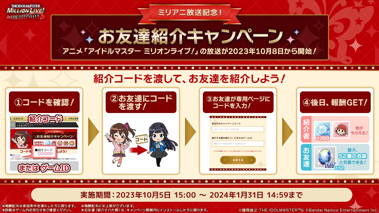 ミリシタでは、アニメ の放送開始を記念して、お友達紹介キャンペーンを実施中です。