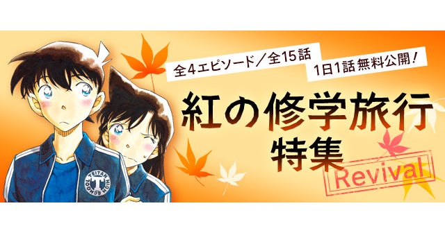 本特集では、紅の修学旅行特集のリバイバルを実施します。「名探偵コナン公式アプリ」内にて、全4エピソード15話を、1日1話無料でお読みいただけます。プレミアムクラブ会員の方は、公開された話は期間中いつでも無料購読できます。会員ではない方も期間中、第94巻の「JKトリオ秘密のカフェ」と各エピソードの1話目は、公開後いつでも無料購読できます。