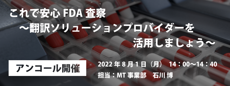 厳格化するFDA査察に対応するために今から準備しておくことは何か?本ウェビナーでは、FDAガイダンス等を効率よく自動翻訳できる環境を社内に整備する方法を弊社AI翻訳「T-4OO」の解説を交えてご紹介いたします。