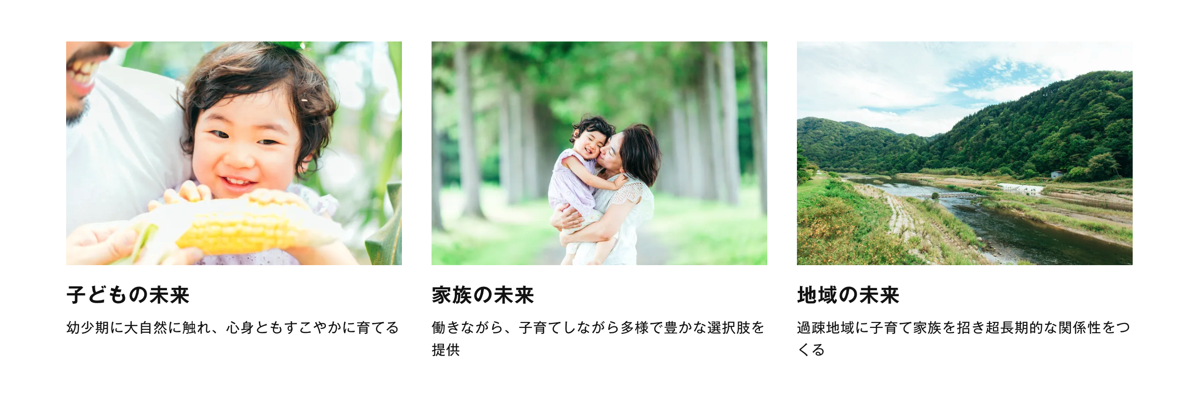 お子さんにとっては、幼少期に大自然に触れ、心身ともに健やかに育つ環境を、ご両親には、働きながら、子育てしながらも多様な選択肢を、過疎地域には、子育て家族を招き、地域経済に貢献をもたらします。