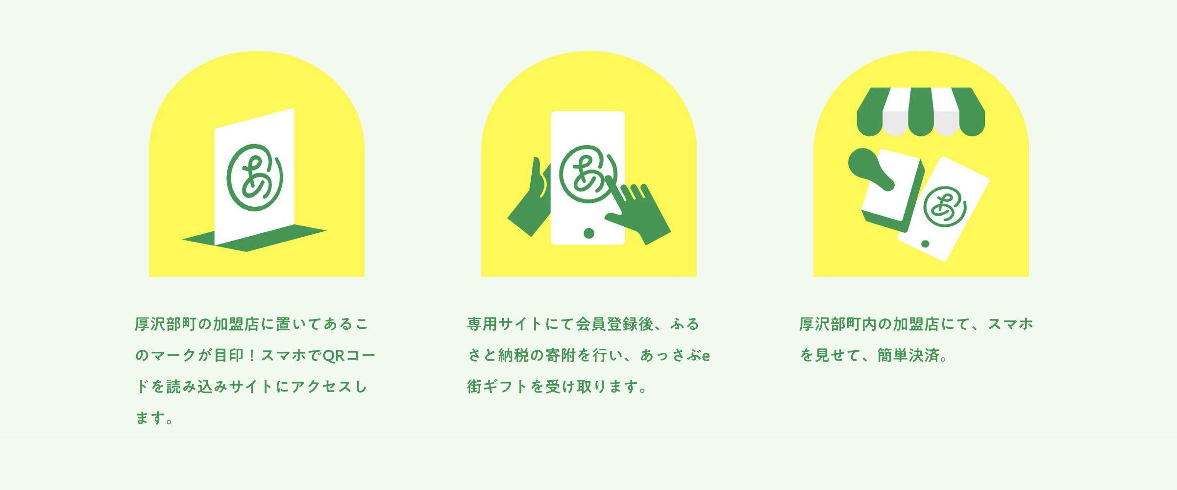 厚沢部町ではこれまで、民間のふるさと納税ポータルサイト等を介した、現地を訪れることなく返礼品がもらえる郵送型のみのふるさと納税を受け付けておりました。この度の「e街ギフト®」と「旅先納税®」システムの導入により、「旅先納税®」の寄附者は電子クーポン「あっさぶe街ギフト」 (返礼品)を寄附サイトのマイページ内より「お礼の品」として即時に受け取り、町内で利用することが可能となります。「あっさぶe街ギフト」は、厚沢部町内の飲食・小売店等の加盟店(全12店舗※2022年7月21日時点)で利用可能な電子クーポンで、観光中や留学中の町内での飲食や買い物を楽しみながら地域経済に還元することができます。