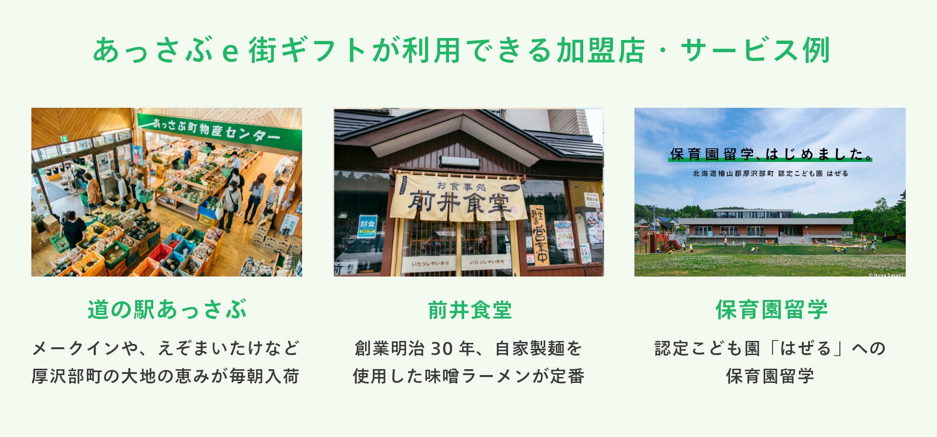 - 厚沢部町の保育園留学には、まだまだ大きな可能性があります。保育園留学は、地域創生の事業であると同時に、これからの社会のあり方を体現する思想です。あっさぶe街ギフトを利用することで、保育園留学に来るご家族がこども園はぜるのみならず、町内のさまざまな事業者さんと関わる機会が増えていくことになります。厚沢部町のふるさと納税寄付額の向上、事業者さんも含め地域経済がより回っていくのはもちろんのこと、留学にくるご家族と地元の人が、直接に話をするきっかけになることも狙いの一つです。厚沢部町は、人口約3,600人の小さな町です。保育園留学を通じて生まれるひとつひとつの出会いが、こどもの未来・家族の未来・地域の未来を、よりよくしていくことは間違いありません。さらには、保育園留学の利用料をあっさぶe街ギフトでお支払いできるようになったことも大きな一歩です。さまざまな社会課題が勢いを増して差し迫る時代において、厚沢部町が全国地域の先進的ロールモデルとなるように、事業パートナーとして引き続き邁進してまいります。
