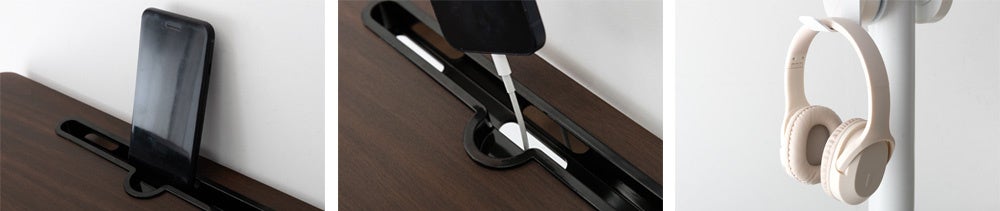 さらにデスク裏にはヘッドホンや鞄をかけることができるフック付きで、使用時に取りやすくサッとかけるだけで収納することができます。