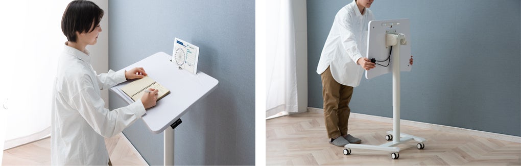 本製品はタブレットスタンドにタブレットやスマホを設置できるため、天板上のスペースを広く確保し、テレワークやリモート学習などのシーンにも快適にご使用いただけます。また、タブレットスタンドにはケーブルを通す穴があるため、タブレットを設置したまま充電が可能です。