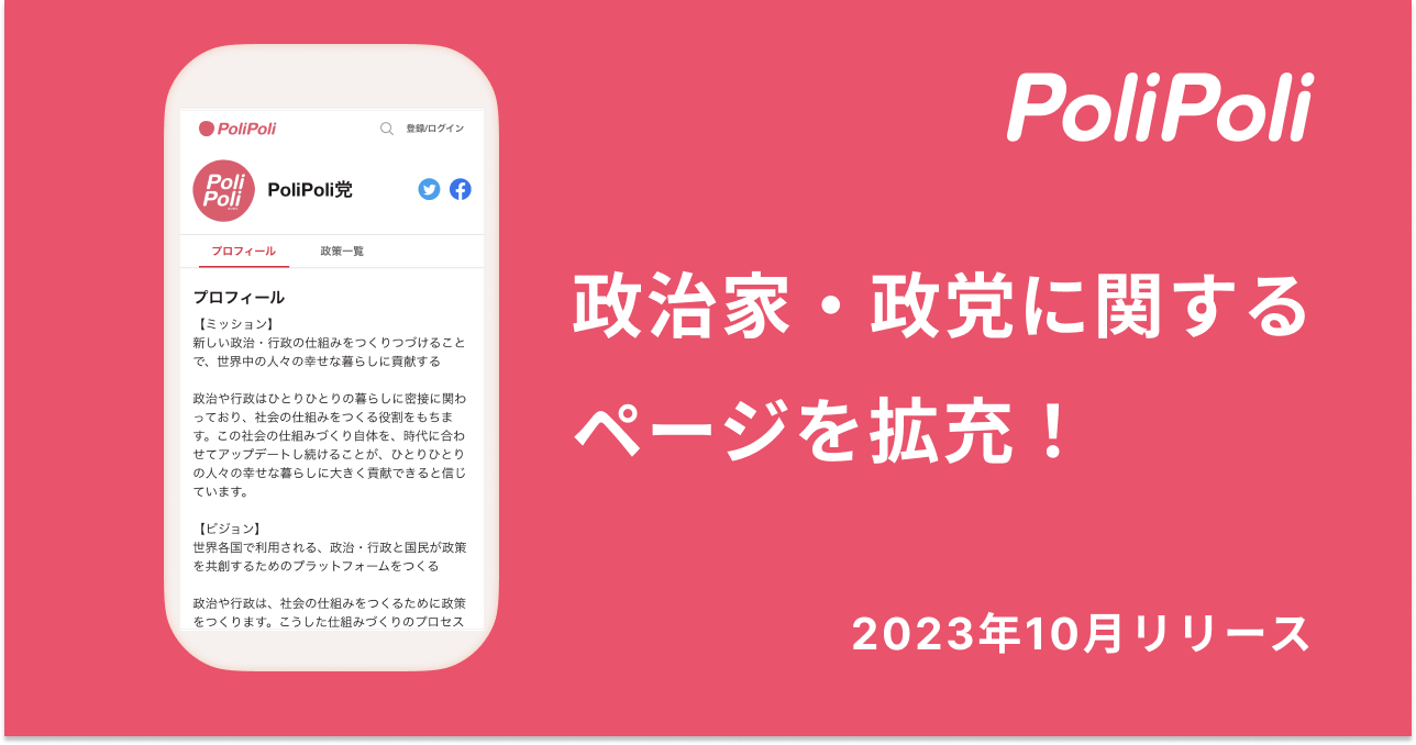 株式会社PoliPoli(東京都千代田区、代表取締役:伊藤和真)は、政策共創を実現するプラットフォーム「PoliPoli」の政治家・政党ページのアップデートをお知らせします。