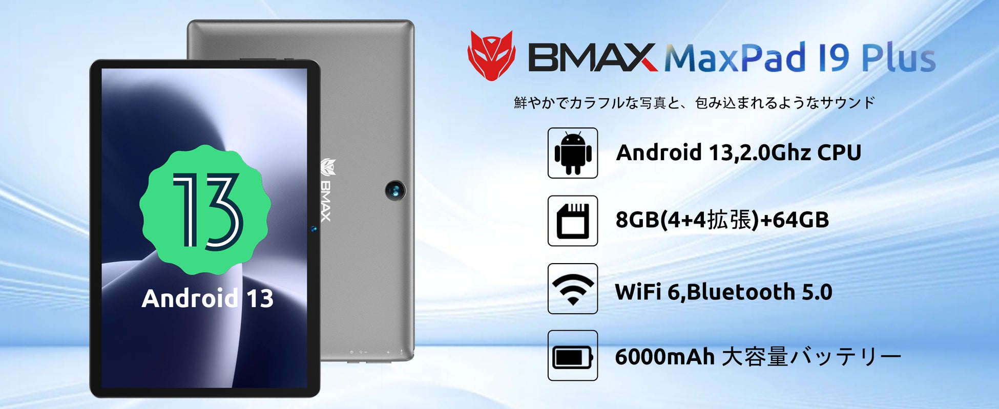 10インチ / Android 13 / 8GB(4+4GB拡張)RAM+64GB ROM+1TB拡張 / WiFiモデル / デュアルカメラ / 画面分割 / 3.5mmヘッドフォンジャック / 児童守護