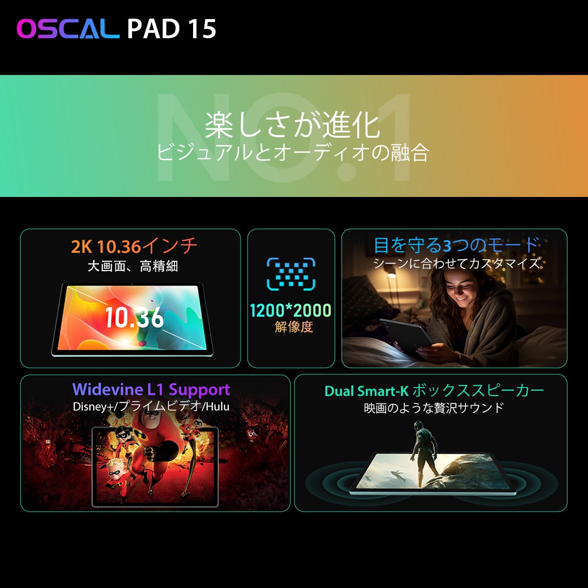 没入感のあるメディア体験を提供するため、Oscal Pad 15は2000×1200(FHD+)解像度に対応した、より大きな10.36インチディスプレイを搭載しています。Widevine L1のサポートにより、Disney+、Prime Video、Huluなどのプラットフォームにおいて、お気に入りの映像を高画質設定で楽しめます。