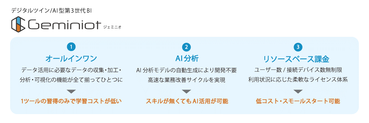 ■AI分析モデルとダッシュボードを自動生成するデジタルツイン/AI型第3世代BI「Geminiot」