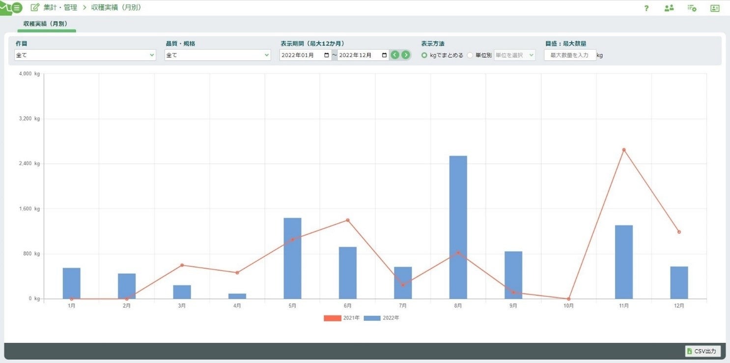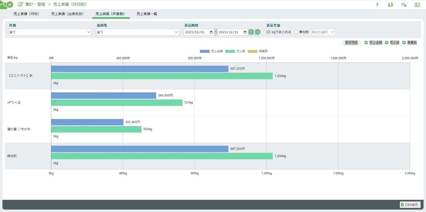 農業経営の現場では、圃場や作付という単位に左右されずに、「出荷要請を満たす十分な収量があったのか」「どこに販売することで、利益を最大化できるのか」「組織全体における生産性はどうなのか」を検証し手立てを検討しなければ、収支の改善に繋がりません。そこで、今回、収支に影響を与える要因である「売上」「収穫」「作業(生産性)」に焦点をあて、グラフで確認することが可能になりました。