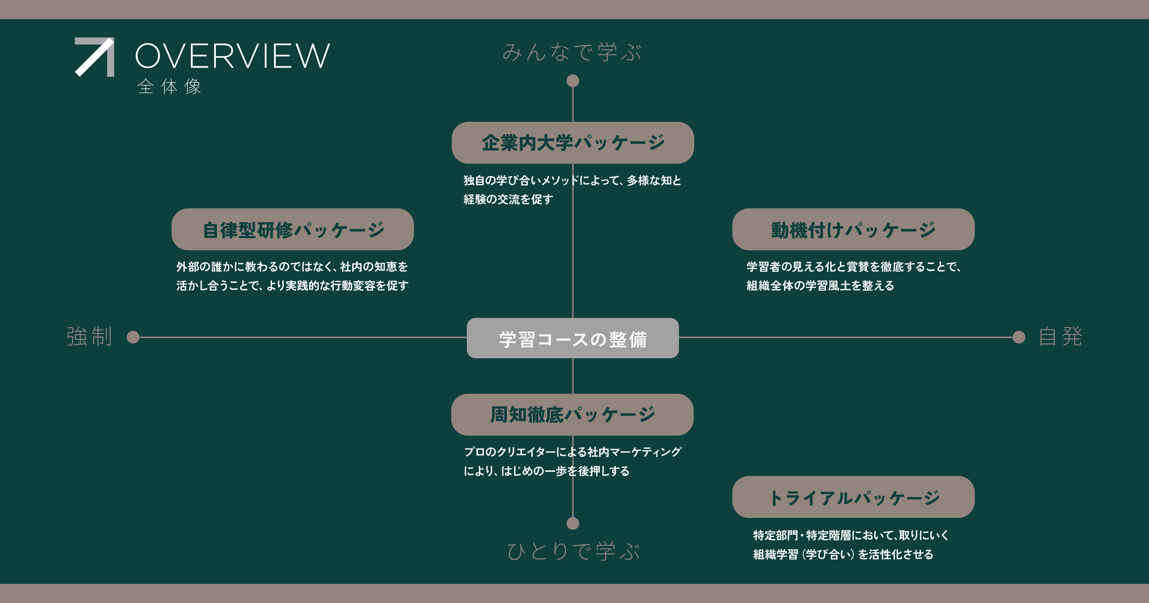 パッケージは「周知徹底パッケージ」「動機付けパッケージ」「企業内大学パッケージ」「自律型研修パッケージ」「トライアルパッケージ」の全5種類。社内での周知や学びの動機付けによる利用促進をはじめ、コミュニティでの学び合いや各企業の課題別の学習プログラムの作成など、当社がこれまで多くの企業様の支援を行ってきた知見を活かし、各企業様の状況に合わせた最適なご提案を行います。