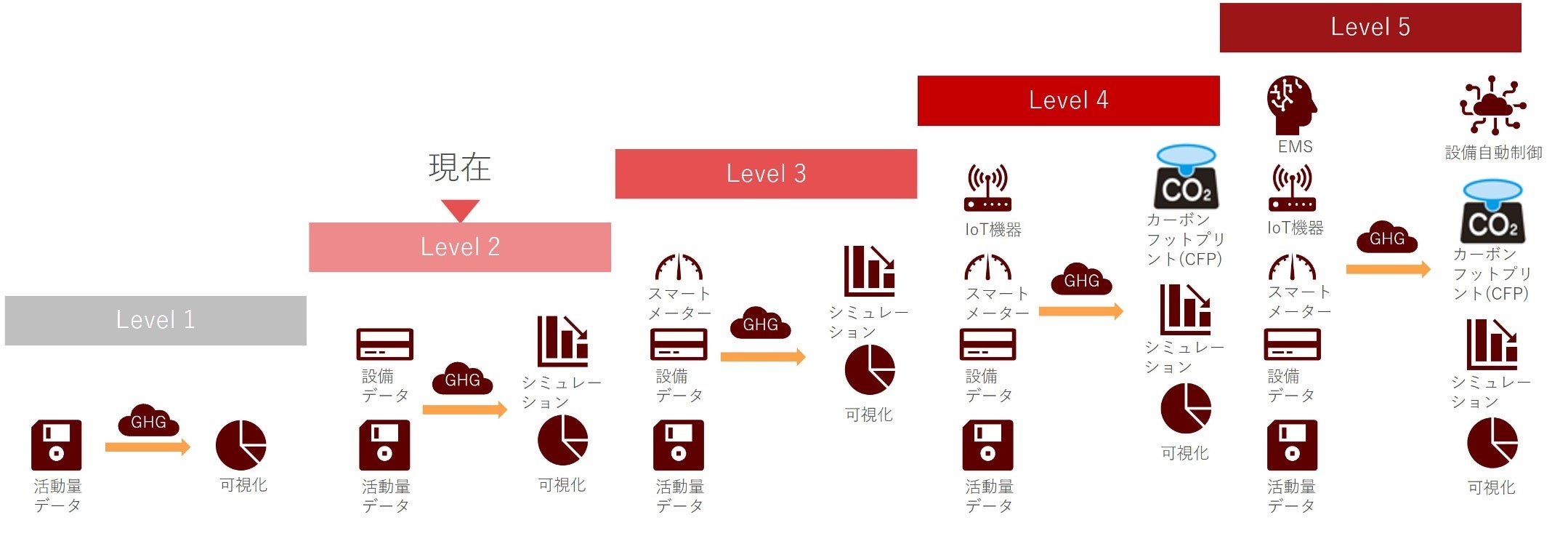 当社ではGHG排出量の可視化・削減シミュレーションに留まらず、段階的にインプットデータと自動データ収集機能を拡充します。将来的にはEMS(エネルギーマネジメントシステム)と連携し、設備を自動制御することによって企業の全体的なエネルギー利用の最適化・GHG排出量削減を目指します。