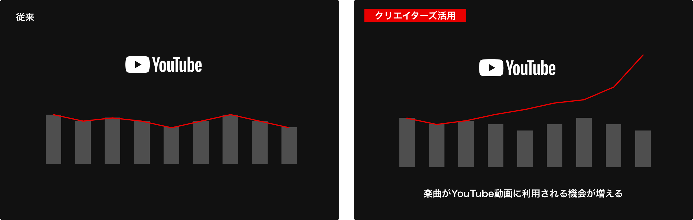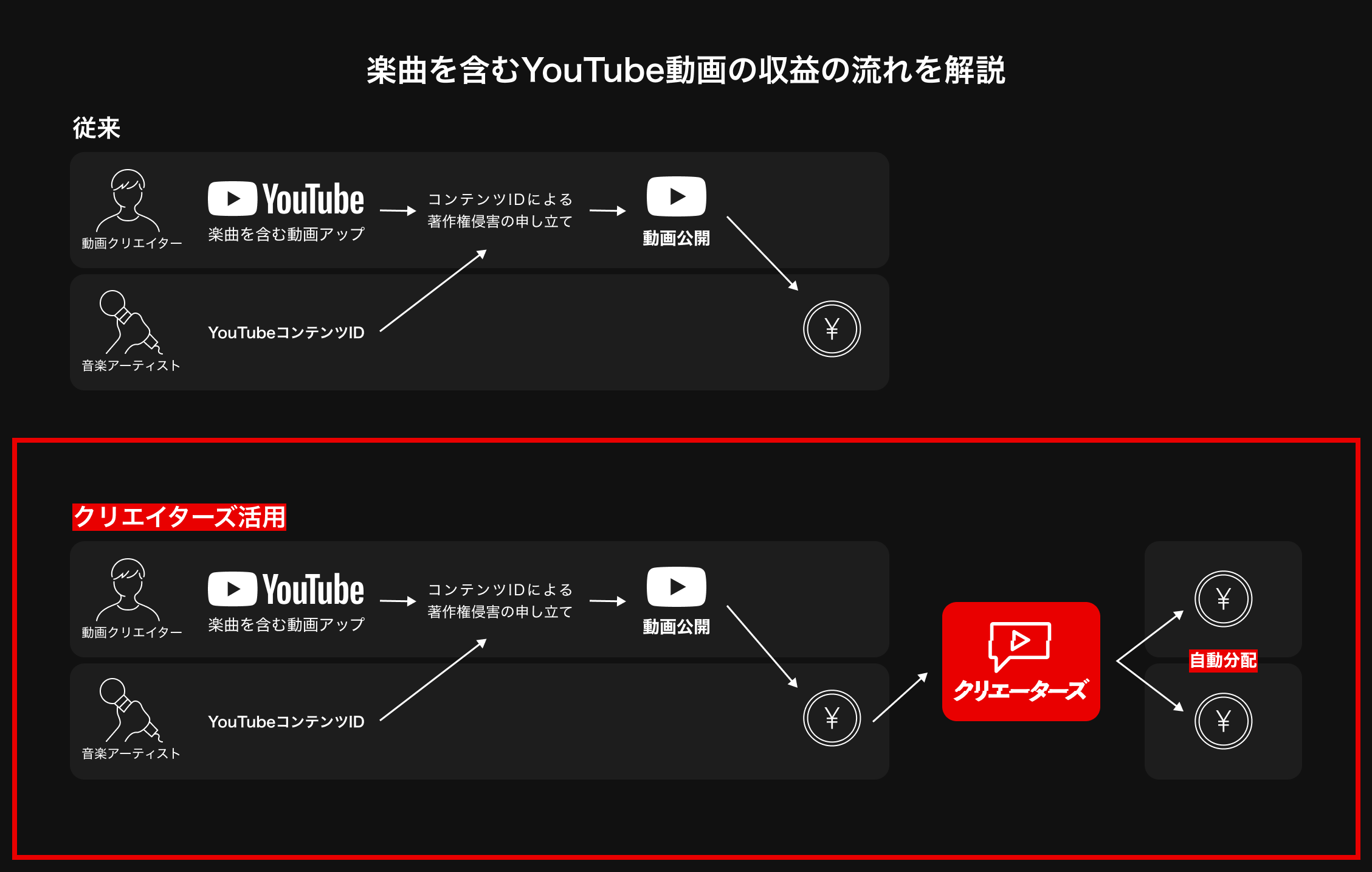 ※音楽アーティストにとっては、動画クリエイターにコンテンツID収益を分配することで動画に利用される機会が増え、収益の増加・楽曲の認知向上が見込めます。