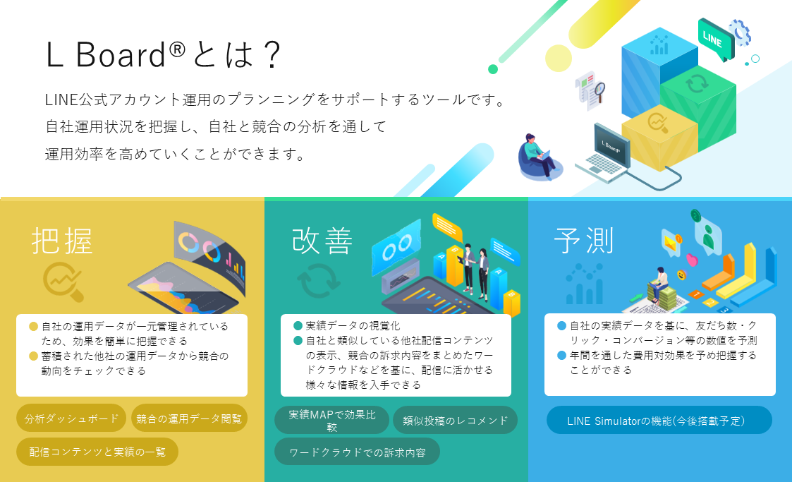L Board®では、プランニングに必要な要素である自社の運用状況や競合の運用状況を「把握」できる機能、施策の「改善」支援を行う機能を実装しています。今後は施策の実行結果を「予測」する機能や施策の最適化をサポートする機能を拡充させ、LINE公式アカウント運用のプランニングでお困りの企業様になくてはならないツールを目指しています。