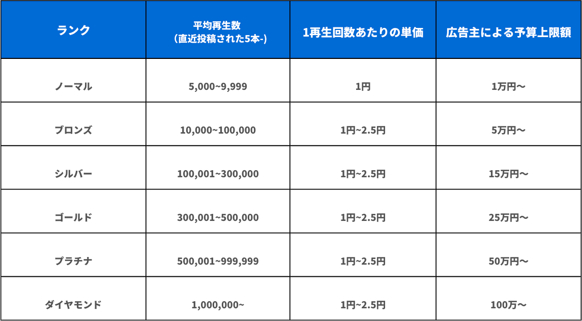 クリエイターには、自身のSNSアカウントに投稿している直近5回の動画の平均再生回数に基づいてランク付けが行われ、また、ジャンルによる分類も行われます。