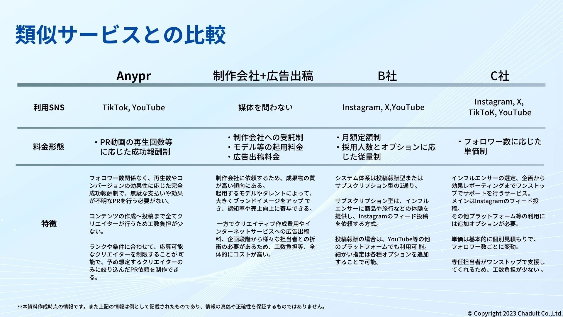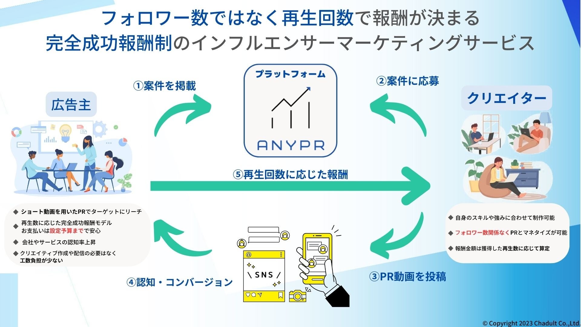 2023年10月、東京都を拠点にするスタートアップ企業「Chadult(チャダルト)株式会社」は、ショート動画に特化したインフルエンサーマーケティングサービス「Anypr(エニプル)」をリリースしました。
