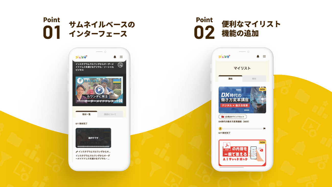 このリニューアルは、受講者が「自ら学び続けること」をこれまで以上に支援することを目的としています。企業社員のeラーニング視聴においてもスマートフォンからの視聴が増加していることを考慮し、スマートフォンでも使いやすいモバイルファーストのUIを採用し、誰でも簡単に利用できるようになりました。