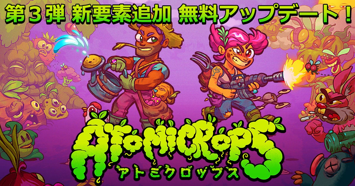 育てて、愛して、戦って!?荒廃した世界で農業をしつつ、襲いくる敵から作物を守る!PlayStation®4 / Nintendo Switch / PC(DMM GAME PLAYER版)対応のファーミングアクションゲーム『アトミクロップス』。不気味かつポップな世界を独特の色彩と魅力的なドット絵で表現した本作に、ステータスが向上する「ネコのぬいぐるみ」や新ステータスなど様々な機能が追加された第3弾アップデートを実施しました!