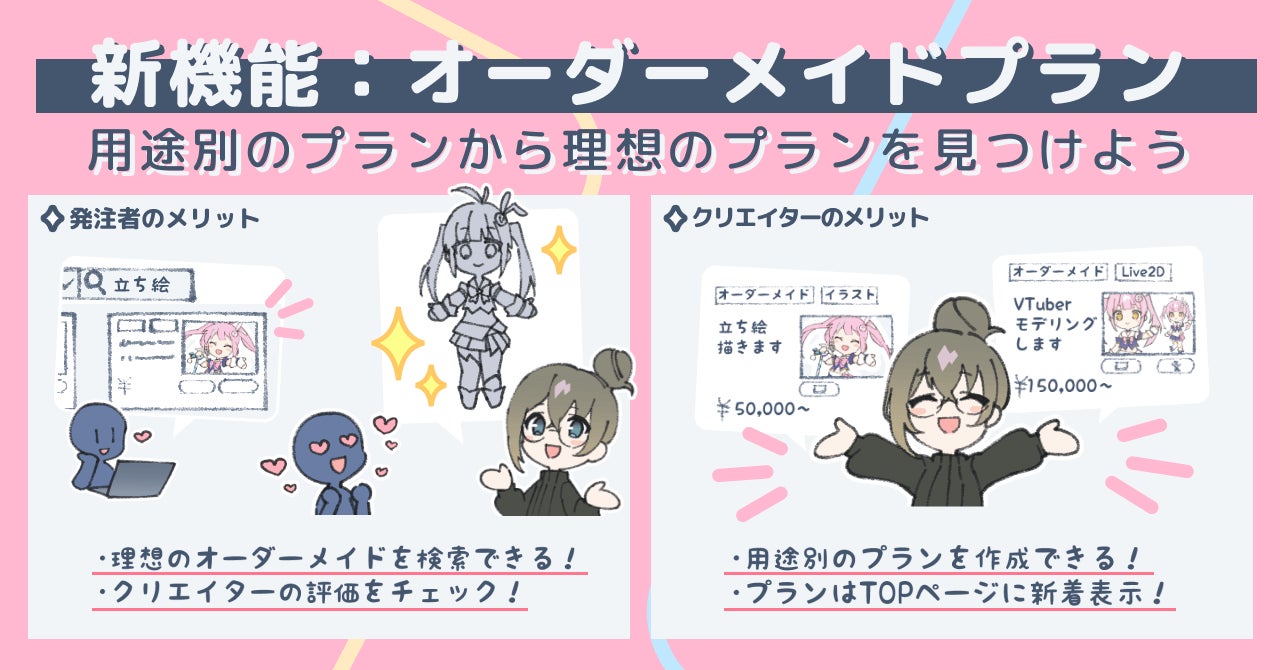 「オーダーメイドプラン」は、クリエイターが「立ち絵制作」「VTuberモデル制作」などの用途別のプランを設定し、発注者がプランを検索してオーダーメイドを発注できる機能です。