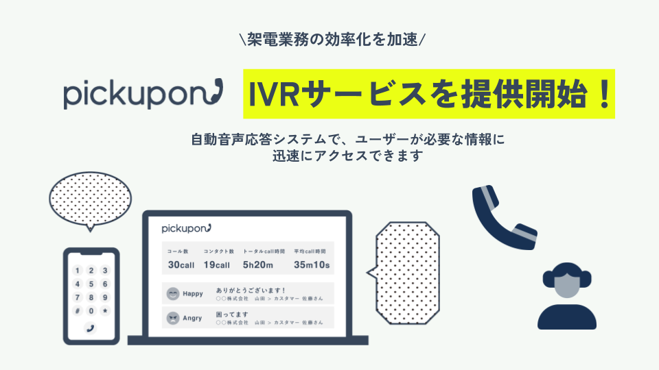 pickuponは、ユーザーがより効果的に顧客とのコミュニケーションを行いビジネスを加速させることができるよう架電業務の改善に向けたサービスを拡充してまいります。その先駆けとして、この度自動音声応答システム(IVR)サービスの提供を開始します。