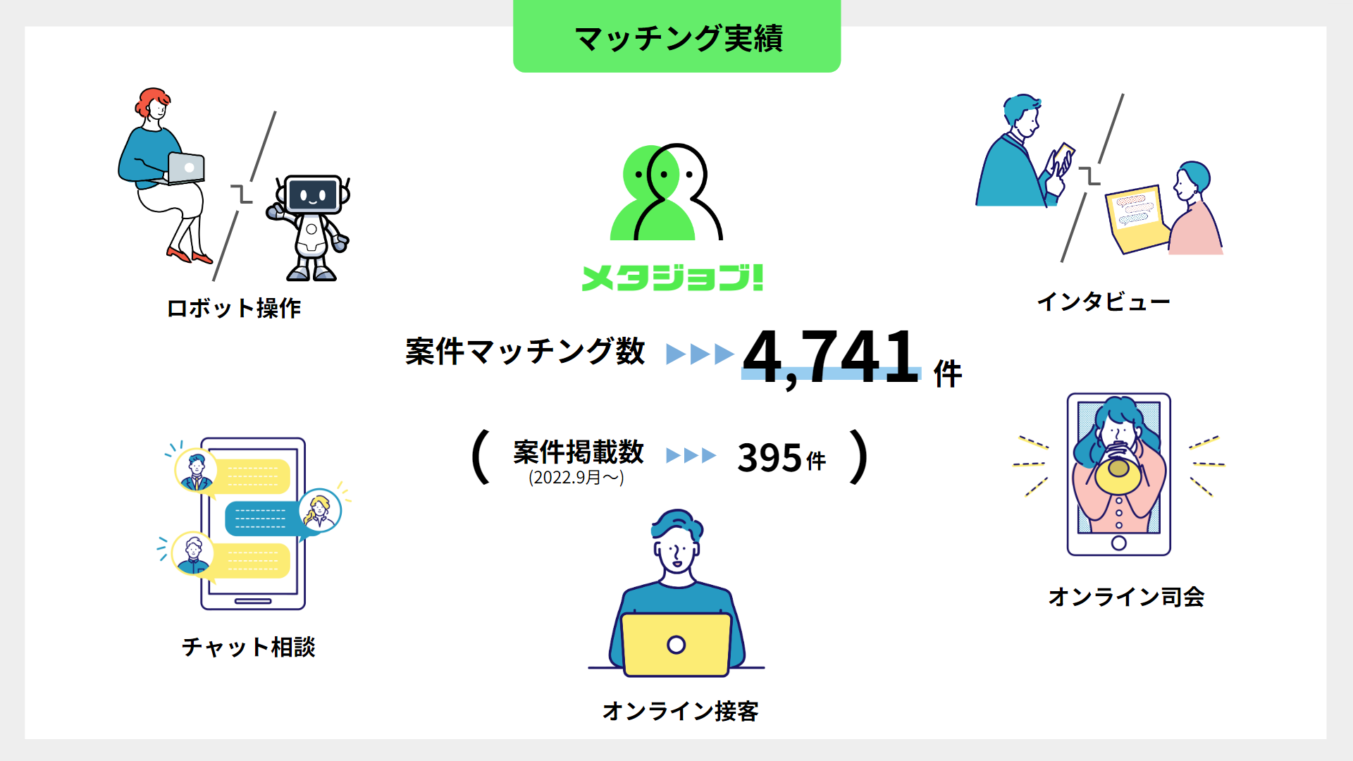 メタジョブ!(https://www.metajob.jp)は、オンラインに特化したスポットワーク専用のジョブマッチングサービス。2022年9月に独自のマッチングシステム「メタジョブ!」の提供を開始し、2023年10月現在、3,800名を超えるワーカー、33社の企業団体に登録いただいています。これまでの掲載案件数は395件、案件マッチング数は4,741件で、案件特性に応じて1名から100名を超える規模まで、幅広くご活用いただいています。