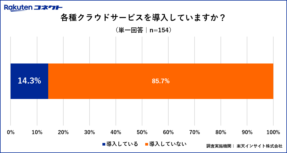 お客様からの電話対応を効率化する各種クラウドサービスがあることを知っていると回答した人に、各種クラウドサービスの導入状況を聞いたところ、14.3%が「導入している」、85.7%が「導入していない」と回答しました。