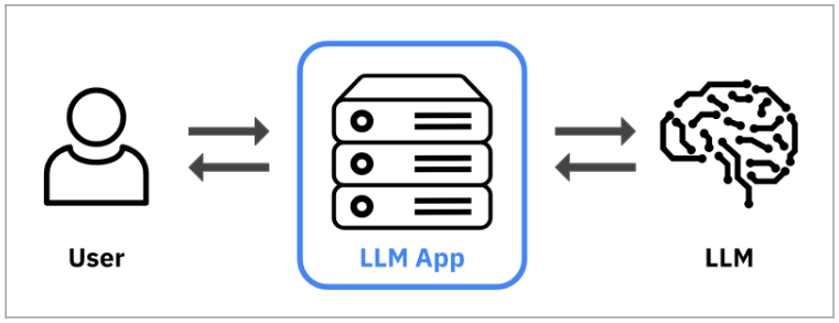 LLMを実際に企業が利用しようとする場合、GPT-3.5(ChatGPTのベースとなるモデル)のような基盤モデル(Foundation Model)を、自ら開発し学習させるようなことは現実的には限られ、多くのケースでは以下の図のように、既存のLLMを業務用途向けに活用するためのアプリケーション(以下LLM App)を開発し、LLM Appを通じて利用するケースが多いと考えられます。