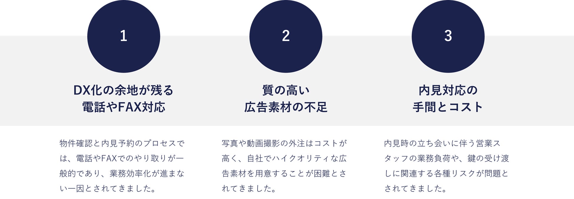 スマホ一つで気軽に内見が可能で、これまで必須であった内見の立ち会いが一切不要に。24時間365日オンラインでいつでも内見予約が可能で、業務効率化を実現しながら営業活動における機会損失を低減します。
