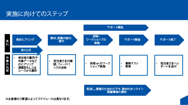 参考画像は、ヒアリングからサポート実施、終了までの一連の流れを示しています。これはあくまで一例で、具体的な流れはお客様のニーズに合わせて調整可能です。また、コースメニューとしては、単発、5回コース(Standard)、完全専用(Professional)の3つのコースをご紹介しております。これらのコースもまた、お客様のご要望に合わせて選択いただけます。