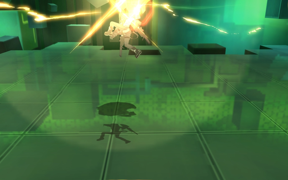 前方へ設置した特殊爆弾を跳び退きながら拳銃で爆発させます。