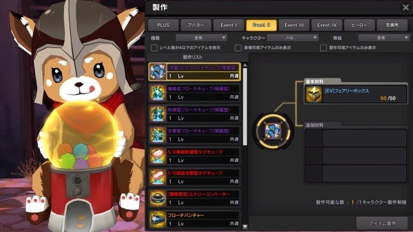 製作に必要な[EV]フェアリーボックスをルーレットで手に入れることで、「イベント限定称号」や「5~6等級タグキューブ」など様々なアイテムと交換可能!