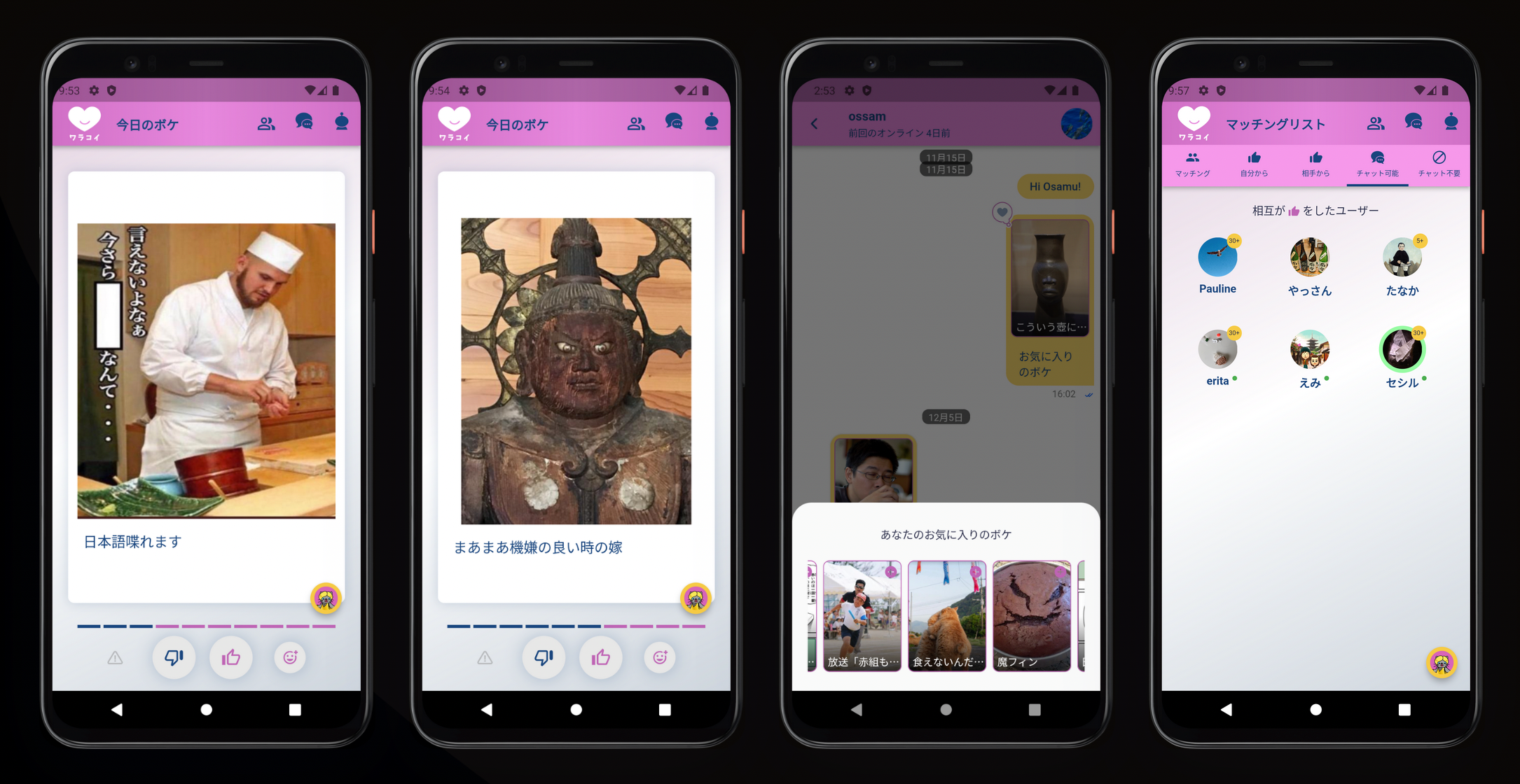 笑いのツボが合う人としか出会えないマッチングアプリ『ワラコイ』は国内最大級のお笑いwebサービス「bokete」から毎日届く10個のボケを直感でスワイプしていくだけ。笑いの好みに共通点が多い相手が候補に出てくる仕組み。