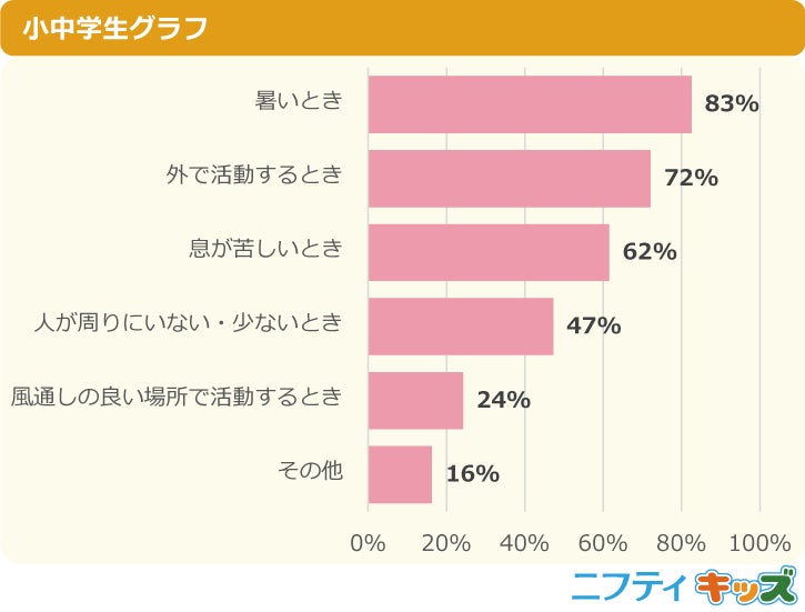 マスクをつけ外ししている小中学生がマスクを外しているときは、「暑いとき」と答えた人が83%で最も多かったです。2位は「外で活動するとき」で72%、3位は「息が苦しいとき」で62%でした。