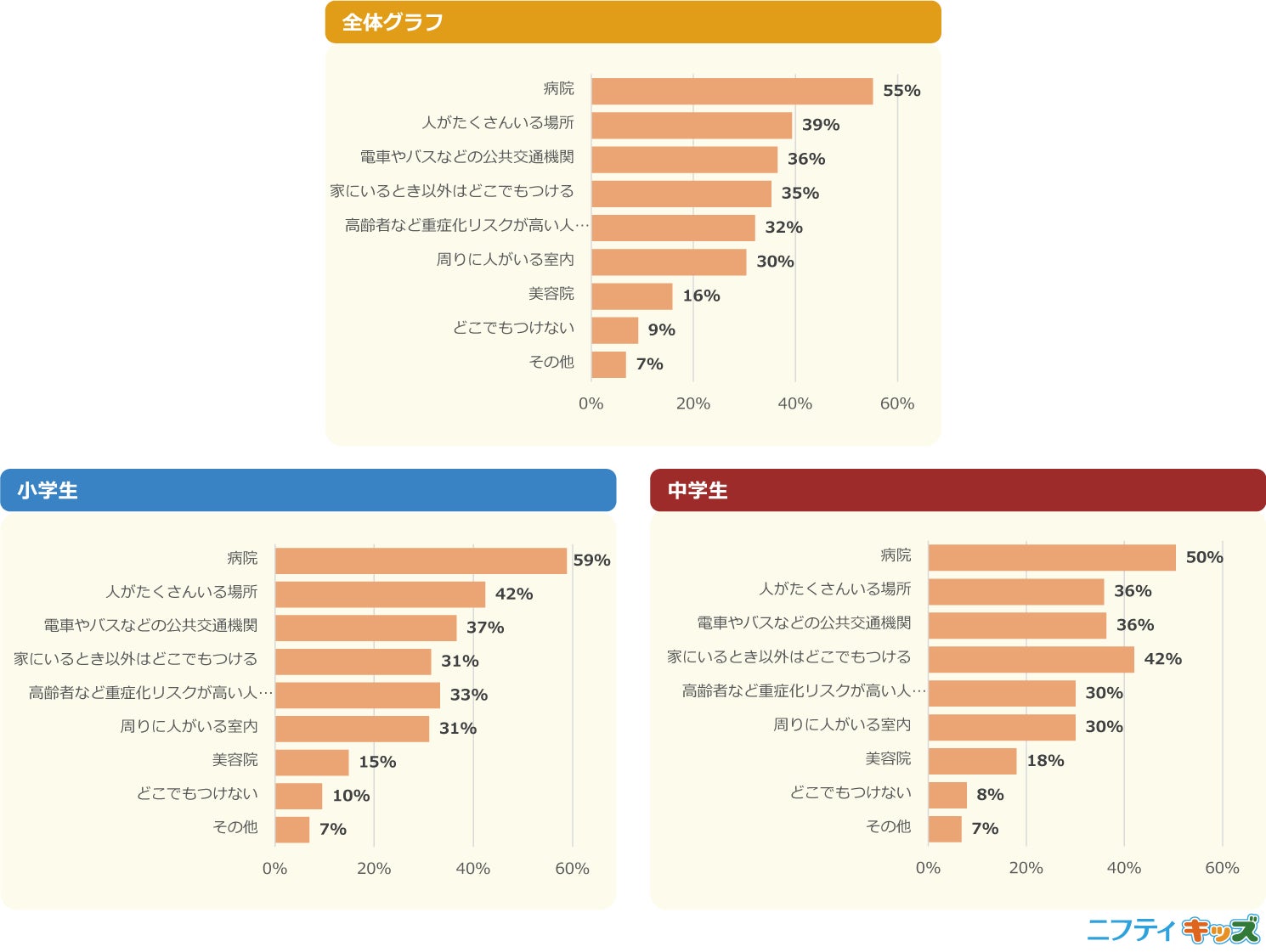 学校以外でマスクをつける場所は「病院」と答えた小中学生が55%と最も多い結果となりました。2番目に多かったのは、小学生が「人がたくさんいる場所」だったのに対して中学生は「家にいるとき以外はどこでもつける」でした。