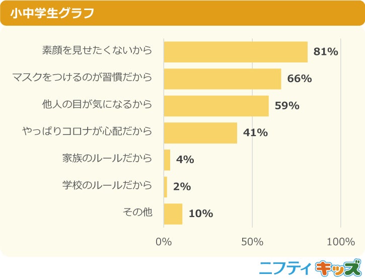 学校でマスクをずっとつけている理由で一番多かったのは、「素顔を見せたくないから」で小中学生の81%を占めました。約3年間にわたりコロナ過でマスク生活をしてきたので、いざ“マスクをつけなくていい”と言われても習慣を変えるのには抵抗がある人が多く、入学した時からマスクをして登校するのが当たり前になっていた人にとっては、“マスクなしの顔”を改めて見せるのは少し恥ずかしい気持ちもあるのかもしれません。