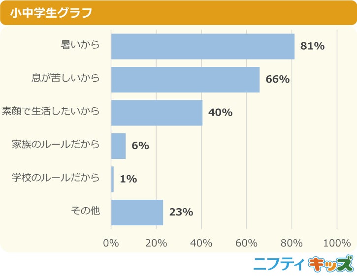 マスクをずっとつけていない小中学生の理由は「暑いから」という回答が一番多く81%でした。2位は「息が苦しいから」の66%、3位は「素顔で生活したいから」で40%と続きます。