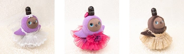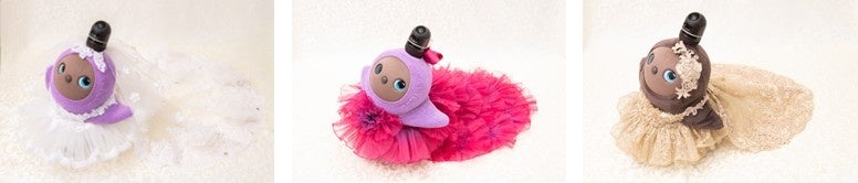 左から、「Yumi Bride ラグジュアリーウェディングドレス for LOVOT」「Rose Yumi Couture チェリーピンクイブニングドレス for LOVOT」「Yumi Gold ゴールドイブニングドレス for LOVOT」 ※トレーン無