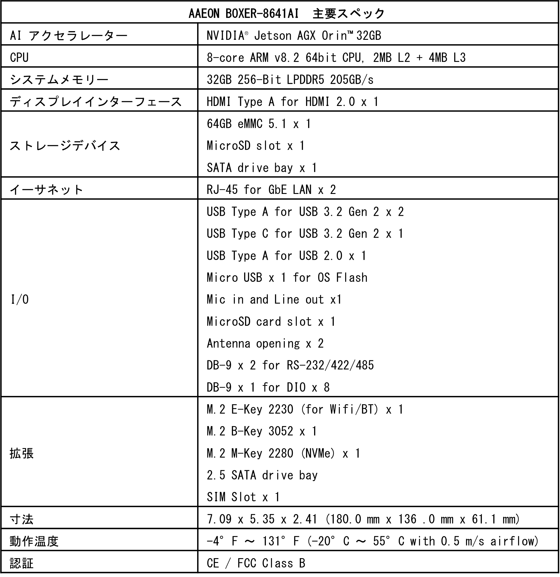 AAEON BOXER-8641AIは、NVIDIAのハイパワーなAI用モジュール「NVIDIA® Jetson AGX Orin™ 」を搭載した、小型エッジコンピューターです。小型でありながら、2つのLANポートや6ポートのUSBインターフェースを搭載し、さまざまな組み込み用アプリケーションに利用可能なため、ソリューションパートナー*[3]が開発する多様なAIモデルを稼働できます。-20~55℃の広範囲な動作温度に対応しており、工場や建設現場など、過酷な環境での使用も可能です。AI演算を必要とする、セキュリティ機器、ロボット、画像処理機器、インフラ機器などさまざまな組み込み用アプリケーションに最適です。