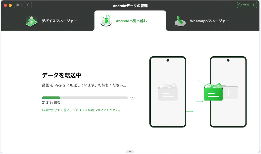 DroidKitはAndroidデバイスに適用する専門的なデータ管理ソフトで、写真、ビデオ、ファイルなどほとんどの種類のデータが移行できます。数クリックだけで大切なデータが新しいスマホで見えます。それだけでなく、DroidKitはiPhoneからAndroidへとAndroidからAndroidへのデータ移行にも対応できますので適用範囲はとても広いです。