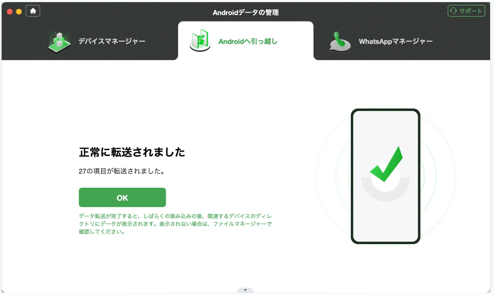しばらくすると、正常に転送されました画面が出ます。転送が完了します。