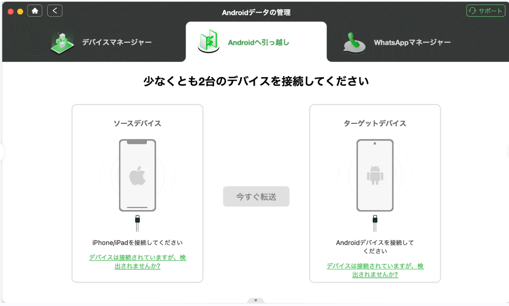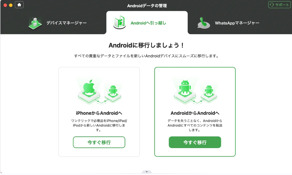 iPhoneからの移行手順は大きな違いがないです。ただ、Step2の時、【iPhoneからAndroidへ】を選択します。そして、「今すぐ移行」をクリックします。