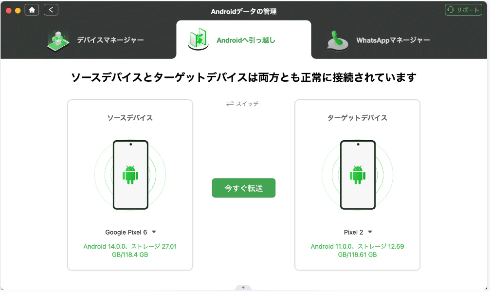 Step3. 古いAndroidスマホとXperiaスマホ両方もUSBケーブルでパソコンに接続します。ソースデバイスとターゲットデバイスを確認したら、「今すぐ転送」をクリックします。