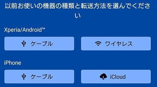 Step2.新しいXperiaでXperia Transfer 2を開き、古いデバイスの種類と転送方法(ケーブル、ワイヤレス、iCloud)を選択します。