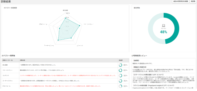診断対象のランディングページに対して、ライティングやユーザビリティなどに関する全50項目以上の観点から、独自のアルゴリズムによって多角的に診断を行うツールです。